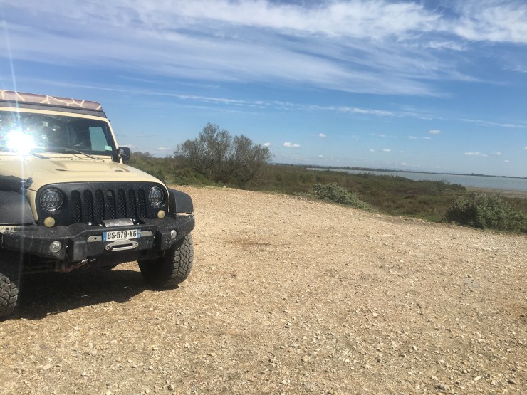 Nous commençons notre parcours par les salins de Giraud. Tout près de chez nous mais beaucoup d’endroits restent à connaître. La preuve avec cette piste que nous empruntons un peu avant les saintes marie de la mer et qui nous fait longer le parc naturel de Camargue avec ses flamants roses et toute sa faune….moustiques compris !!!!