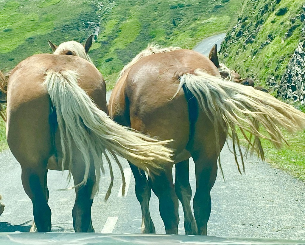 Encore un peu de culture en attendant qu’ils passent leur chemin: Ce sont des pottok! Une race de poney vivant principalement à l’ouest du pays basque. D’origine très ancienne, il présente des ressemblances morphologiques avec les chevaux des peintures rupestres de la même région.