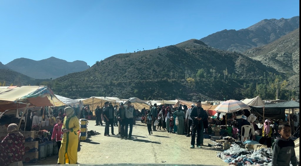 TraversĂ©e de tafraout, pendant le marchĂ© , un petit chemin de terre un monde fou, des Ă©tals de chaque cĂŽtĂ©, des marchandises improbables dont une tĂȘte de dromadaire avec son long cou qui pend sur son crochet đ€ą et nous au milieu đ