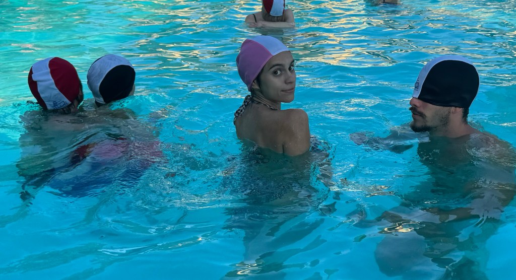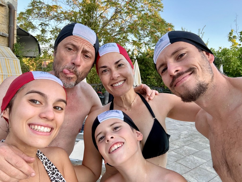 Un plouf dans la piscine parce qu’il fait 600 degrés, et toujours avec nos jolis bonnets (oui c’est leur truc aux italiens… )