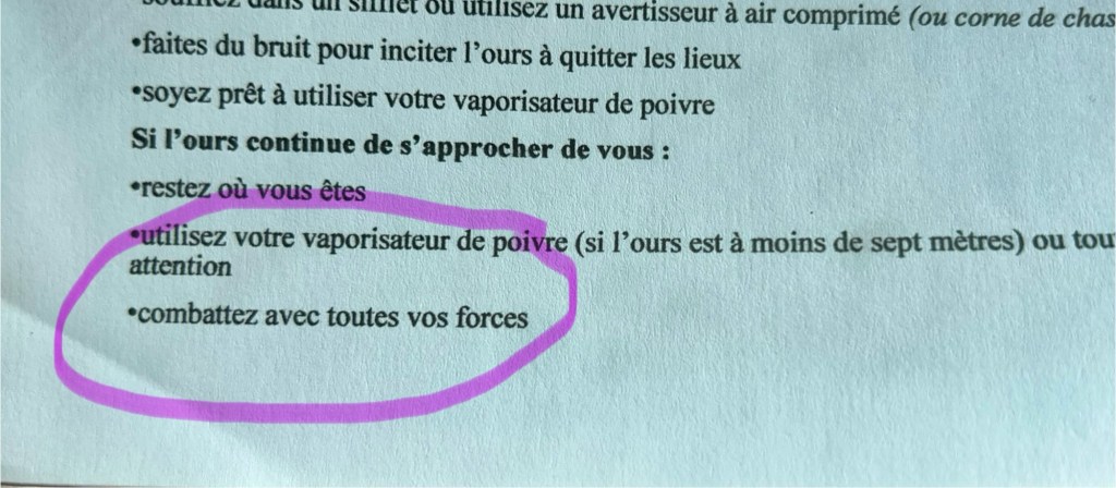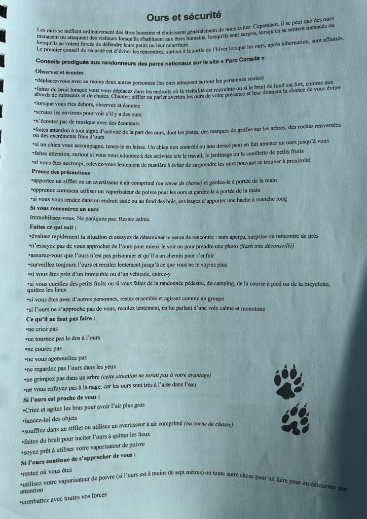 Alors pour les inquiets qui nous lisent, ( je pense a une ou 2 personnes en particulierâŠ) on est en sĂ©curitĂ©!! Et on a bien Ă©tudiĂ© les consignes de sĂ©curitĂ© face a lâours đ€Ș