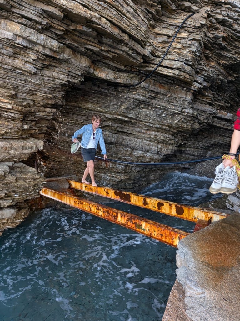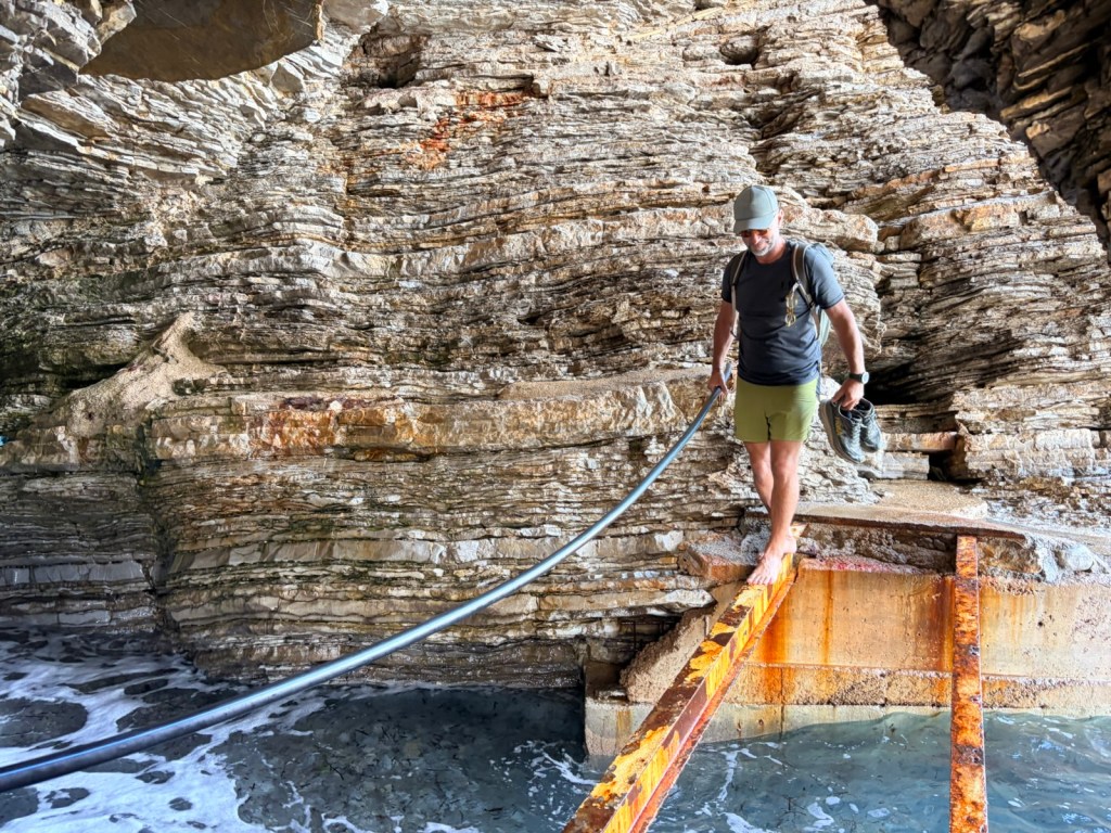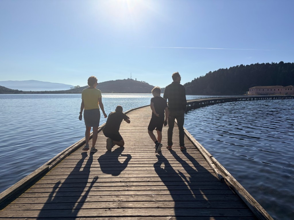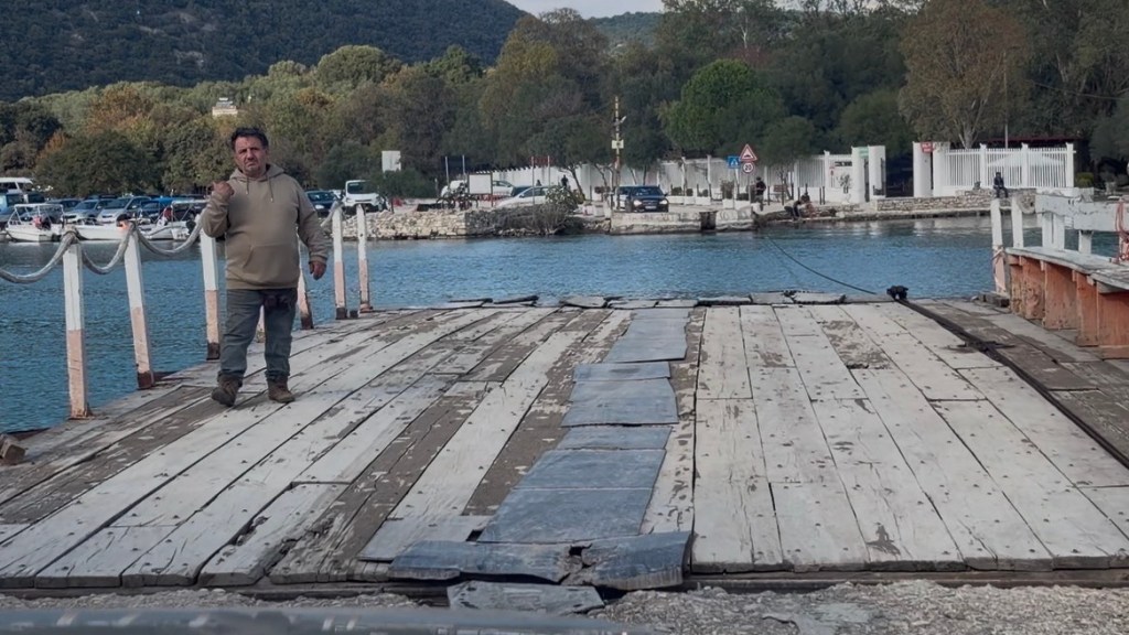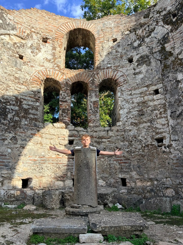 On passe un bac improbable, en vieilles planches, tirĂ© par des cĂąbles pour rejoindre lâautre rive et aller au site archĂ©ologique de BUTRINT (classĂ© au patrimoine mondiale de lâUNESCO! Oui oui oui)